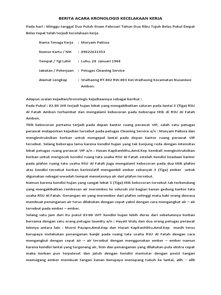 Nov 06, 2020 · contoh surat kronologis kecelakaan untuk klaim bpjs. Apr 01, 2019 · isi dari berita acara dan kronologis ini yaitu mengenai penjelasan bagaimana kejadian tersebut bisa terjadi dan di jelaskan sesuai dengan urutan kejadian serta di lengkapi dengan keterangan waktu secara terperinci mulai dari berangkat kerja hingga terjadinya kecelakaan. Sederhananya, berita acara biasanya dibuat pada suatu kegiatan seperti ketika sedang. Berikut ini contoh berita acara yang baik dan benar serta menarik perhatian yang dapat anda gunakan dalam tema maupun format penulisan surat. Contoh format untuk pengajuan klaim bagi karyawan yang mengalami kecelakaan kerja.