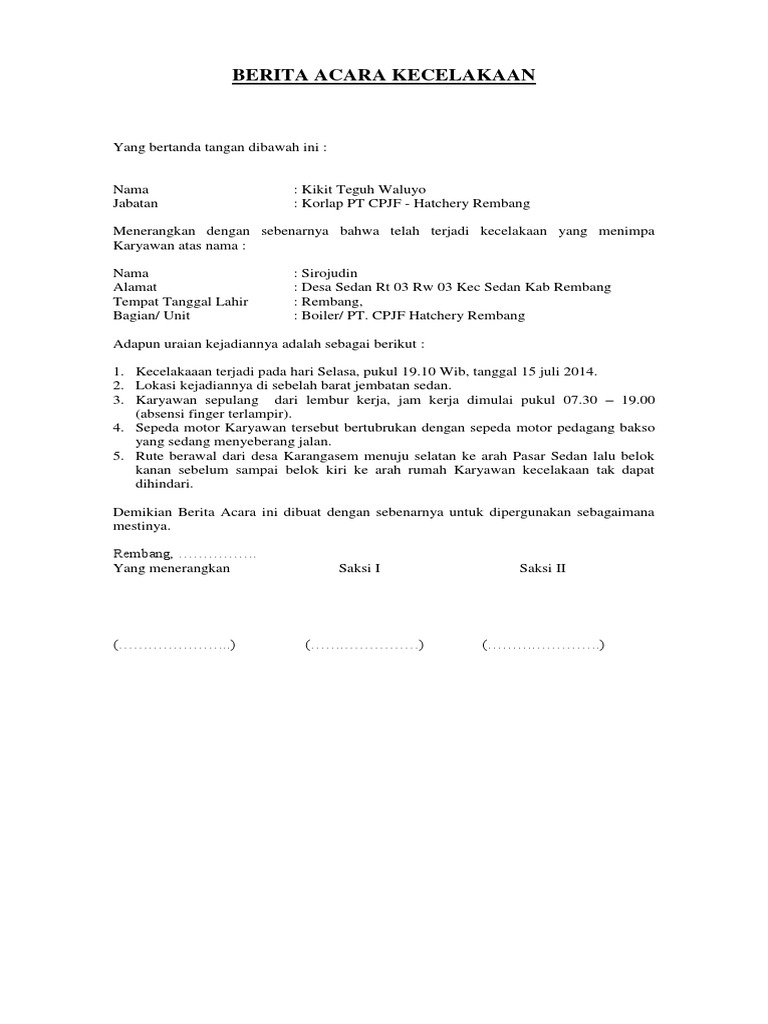 Berita Acara Kecelakaan Kerja from demo.dokumen.tips Aug 19, 2019 · beberapa contoh surat berita acara kecelakaan lalu lintas terbaru 2019. Jul 07, 2020 · berita acara kronologis kecelakaan kerja untuk klaim bpjs ketenagakerjaan. Seperti menjelaskan secara detail dengan. Contoh berita acara kejadian kecelakaan. 11 contoh berita acara rapat serah terima kejadian. Dalam contoh berita acara kejadian, gawe cv telah memilihkan tema atau template yang terbaik untuk dijadikan inspirasi, ide ataupun acuan dalam penulisan surat anda. 3 contoh berita bahasa inggris tentang pendidikan 5 contoh berita singkat dalam bahasa inggris next post 4 contoh berita acara dalam bahasa inggris. Pada hari rabu tanggal 01 juli 2020 sdri.
